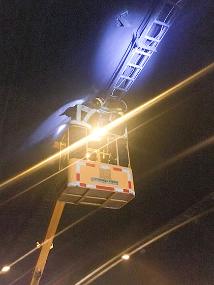 中午11:00,因流量過大,高速交警要求臨時開放被堵主車道。趁此空隙機會,中心隊伍暫撤到黃土嶺隧道管理所解決午餐,之后又馬不停蹄奔赴并集結(jié)在北洞口緊急停車帶,待重新封道后繼續(xù)跟進作業(yè),力爭在審批時間內(nèi)做更多的維修。考慮到主車道燈具損壞不多,抽調(diào)一組登高車人員負責(zé)攝像頭檢修工作,而底下人員則負責(zé)修復(fù)更換消防、緊急電話等標(biāo)志燈,每組人員都在與時間賽跑,忙的顧不上喝水。
