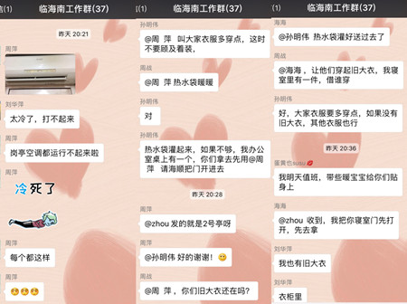 “太冷了,崗亭空調(diào)全都運行不起來了。” “每個崗亭都一樣。” “冷死啦!” “修空調(diào)的師傅來了,檢查了一下,他說這個沒辦法,是因為天氣太冷的原因,并不是壞了。” “大家衣服趕緊多穿點,誰有舊的工作大衣。” “熱水袋灌起來,不夠,我的拿去先用。” “我也有舊大衣。”