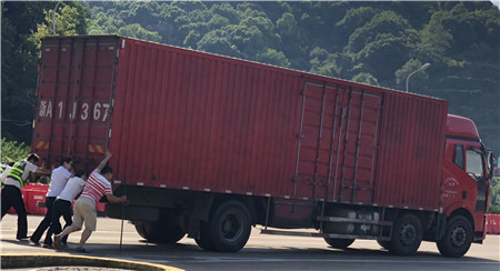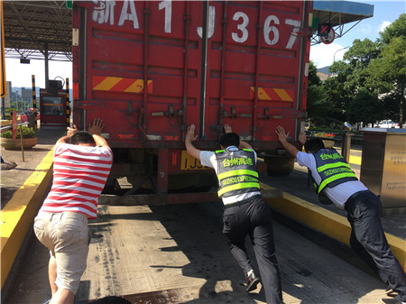 6月19日15時(shí)左右,一輛杭州牌照的大貨車(chē),在進(jìn)入臨海南收費(fèi)所三車(chē)道時(shí)突然熄火拋錨,司機(jī)嘗試了幾次無(wú)法啟動(dòng),立刻下車(chē)檢查車(chē)況。 “師傅,怎么了?有什么能幫您?”收費(fèi)員徐海源見(jiàn)此情景,立即上前熱心詢(xún)問(wèn)。 “哎!包在油箱口的塑料紙?jiān)趺淳偷暨M(jìn)油箱內(nèi),現(xiàn)在車(chē)子怎么都發(fā)不動(dòng)不了。”司機(jī)有點(diǎn)發(fā)急地回答。 “師傅,別著急,我先找?guī)讉€(gè)同事幫您把車(chē)推出車(chē)道。”收費(fèi)員趕緊安慰司機(jī)焦急心情。 “好的,那謝謝你們?!彼緳C(jī)連忙點(diǎn)著頭。為了避免車(chē)道堵車(chē),徐海源立刻利用對(duì)講機(jī)向當(dāng)班班長(zhǎng)周萍說(shuō)明情況,周萍立刻關(guān)閉該車(chē)道,啟動(dòng)備用車(chē)道。此時(shí)此刻,收費(fèi)員李俊杰、楊旭佳毫不猶豫的趕了過(guò)來(lái)與駕駛員一起推動(dòng)車(chē)子?!耙弧⒍?、三,一、二、三,使勁呀……”可是車(chē)子仍然紋絲不動(dòng)。怎么辦?請(qǐng)求支援!正準(zhǔn)備下班的行政人員陳瑩、劉華萍得知情況后,二話(huà)不說(shuō)飛奔到車(chē)道,加入到推車(chē)行列中。用力推呀——哎,不行;再來(lái)一次——還不行。面對(duì)23.97噸的大貨車(chē),大家仍是束手無(wú)策?!叭フ腋F棒試試!有道是給你一根鐵棒,我能翹起整個(gè)地球。”不知是誰(shuí)大喊了一聲?!靶校梢栽囋嚕烊フ摇痹?huà)音剛落李俊杰快步跑向所內(nèi),尋找鐵棒。不一會(huì)兒,只見(jiàn)他興奮地高舉鐵棒沖著大家喊道:“找到了!找到了!”