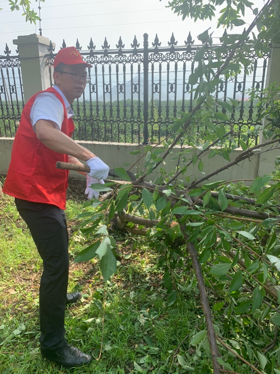 圖為志愿者合影 8月13日上午,該所志愿服務隊身穿統(tǒng)一紅色馬甲,積極投身到災后恢復工作中。 “把砍刀給我,我力氣大,讓我來。” 活動過程中,孫明偉、杜廣勝、楊堅等同志一行先查看了配電房周邊綠化帶,看到有樹木倒伏,壓在防護網(wǎng)上,存在較大安全隱患,他們二話不說立即手拿砍刀,對樹木進行切割處理,并由李學平、包德福等人安排拉車將斷木等清理干凈。