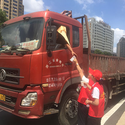 圖為骨干人員為過往司機遞上降溫降暑用品