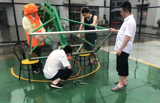 圖為所負責人帶領人員拆卸籃球架 此前,溫嶺西已經做好基礎的抗臺防范工作,關閉所內各寢室、辦公室門窗,提前裝好沙袋備用,準備好抗臺物資及近幾天的餐食,確保所內各項事務正常運行。8月9日上午,該所長、副所長在臺風前做最后一次細致的排查,三人還親自動手將陽光房的窗戶都卸下來,避免風力太大,玻璃破裂,造成安全隱患。此外,為預防操場籃球架承受不住巨大風力,將籃球框拆卸下來,把籃球架放倒。其后通知所內開車的人員將所有車輛停入操場中,以防止周邊樹木被風刮斷,造成車輛損失。 林夢灑