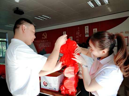 圖為工作人員一起布置收費(fèi)所 在慶祝祖國70周年生日的日子里,最火的顏色就是紅色。為了弘揚(yáng)中華民族傳統(tǒng)文化,溫嶺西收費(fèi)所后勤組早早購置了燈籠、彩旗、五星紅旗,寫好“慶祝祖國70周年華誕”大字等。黨員帶頭,團(tuán)員緊跟,一線收費(fèi)員紛紛參與,在收費(fèi)站大門口、辦公樓、食堂、宿舍等區(qū)域精心用五星紅旗、大紅燈籠、五顏六色的彩旗裝點(diǎn),一抹抹艷麗的國旗紅,成為站點(diǎn)最靚麗的風(fēng)景。明亮的黃、鮮艷的紅,美麗窗口突然亮了起來,到處洋溢著濃濃的國慶氛圍,為過往司乘提供暢、潔、美的節(jié)日行車環(huán)境。 溫嶺西收費(fèi)所后勤組還精心策劃、精細(xì)編排,制作了具有特色、獨(dú)具創(chuàng)意的生日祝福“小視頻”,祝祖國生日快樂! 通過開展弘揚(yáng)愛國精神,喜迎國慶活動(dòng),溫嶺西收費(fèi)所全所工作人員更加不忘初心,砥礪前行,共同慶祝祖國70周年華誕。 鄭霞霞