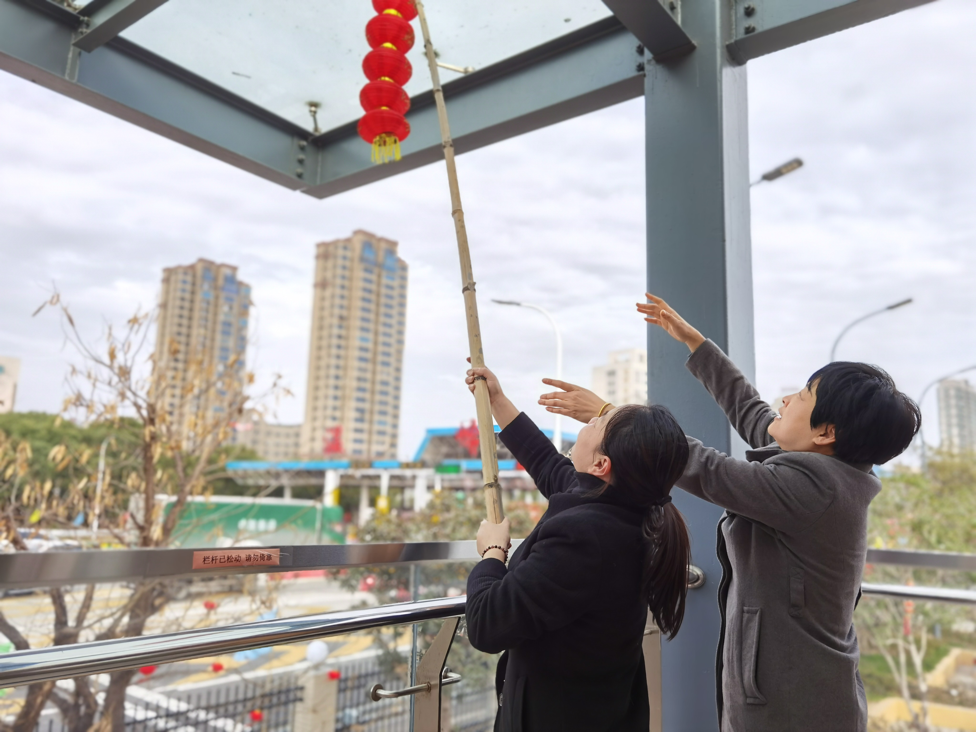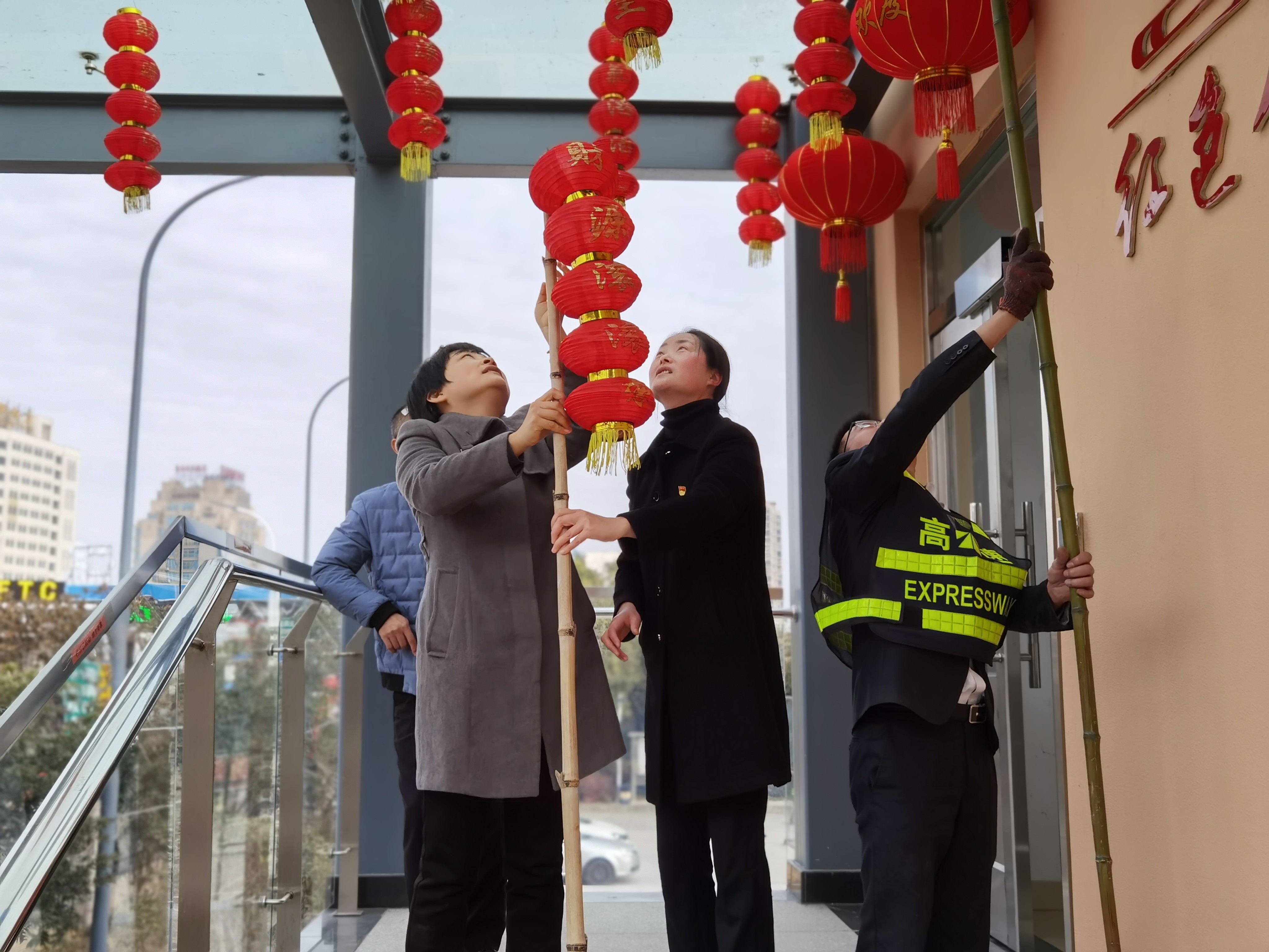 大家分工合作,搬梯子、遞春聯(lián)、貼膠帶、校正高低。在站所內(nèi)每個角落都掛上了紅彤彤的燈籠;收費區(qū)域內(nèi)廣場兩邊的欄桿上扎著一面面彩旗。一幅幅精致喜慶的對聯(lián)、“福”字,一串串三角彩旗,一個個大紅燈籠把整個收費站所點綴得處處洋溢著濃厚的節(jié)日氛圍,“年味”十足,讓在站員工和過往司乘朋友感受到新年的喜慶氛圍和“家”的溫暖。