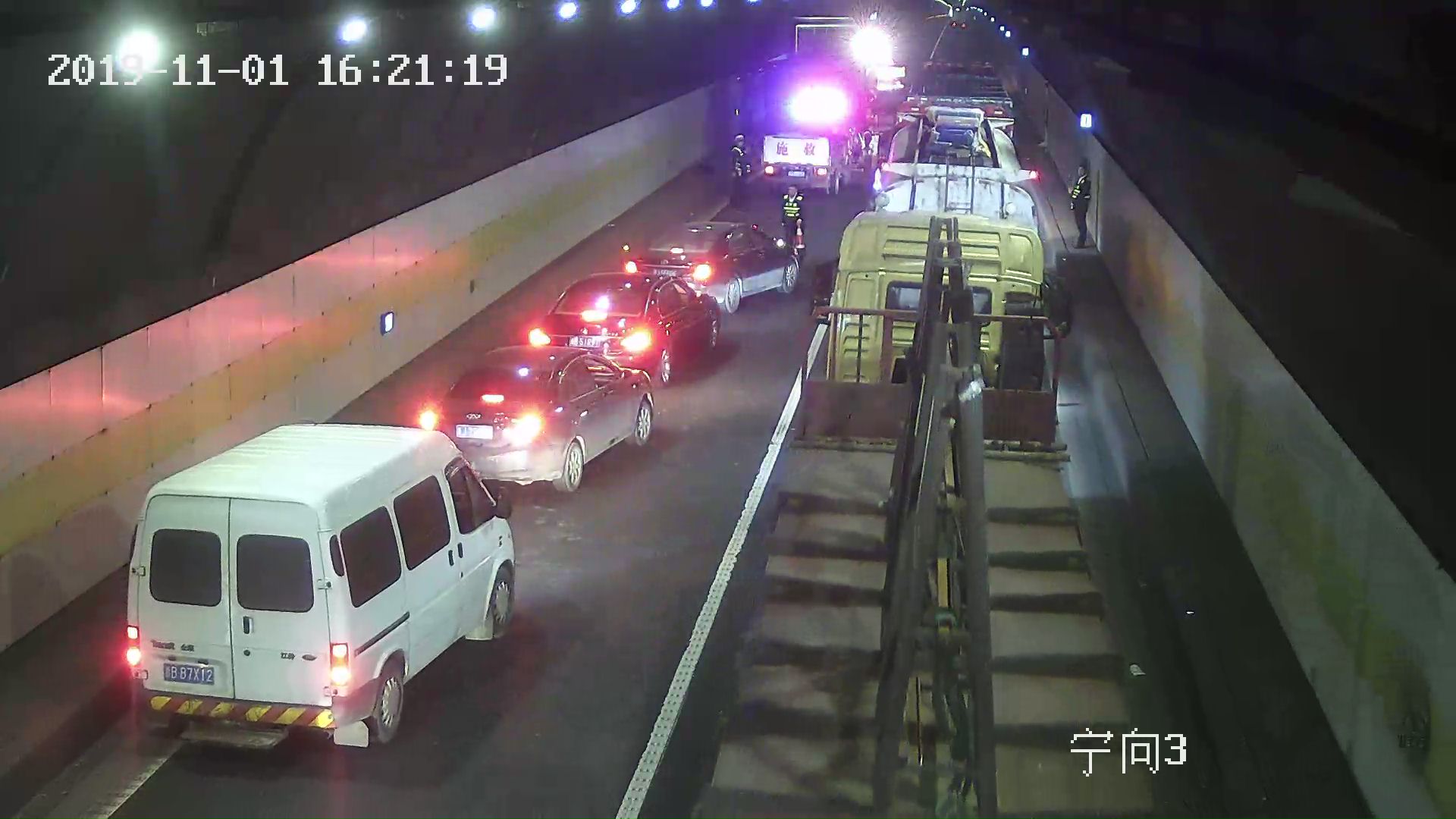 隧道內(nèi)三車(chē)追尾,“指揮員”“救援隊(duì)”“搬運(yùn)工”齊上陣 11月1日14時(shí)23分,黃土嶺隧道所中控員王之佳發(fā)現(xiàn)寧向隧道進(jìn)洞300米處超車(chē)道發(fā)生一起三車(chē)追尾交通事故。于是,執(zhí)勤隊(duì)員火速趕赴事故現(xiàn)場(chǎng)。 事故現(xiàn)場(chǎng),一輛貨車(chē)橫跨在超車(chē)道上,貨車(chē)上的桔子散落一地,現(xiàn)場(chǎng)一片狼藉,事故車(chē)輛占用了隧道內(nèi)僅有的兩個(gè)車(chē)道,導(dǎo)致后方車(chē)輛一度無(wú)法通行。所幸的是司機(jī)只有輕微受傷。