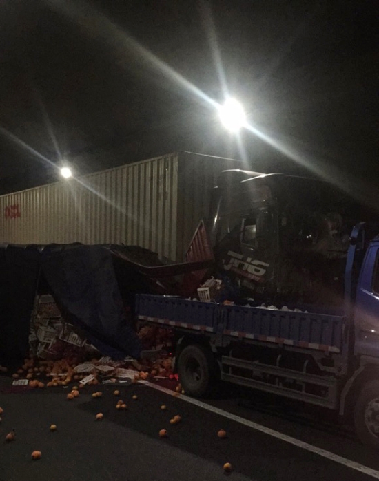 圖為事故現(xiàn)場(chǎng) 得知此情況,所負(fù)責(zé)人第一時(shí)間趕赴事故現(xiàn)場(chǎng)。事故就是命令!救援隊(duì)伍立即兵分三組,一組由駕駛員林通用巡邏車(chē)送傷者至臺(tái)州收費(fèi)所出口,與前來(lái)救援的120救護(hù)車(chē)進(jìn)行對(duì)接,一組由金志輝、宋勤滿在寧向南洞口卡口,一組由李海福所長(zhǎng)、應(yīng)錦清副所長(zhǎng)在現(xiàn)場(chǎng)協(xié)調(diào)指揮,同時(shí)配合交警維護(hù)通行秩序,與交警一起對(duì)事故現(xiàn)場(chǎng)展開(kāi)救援。 經(jīng)了解,由于藍(lán)色貨車(chē)超車(chē)道緩慢行駛,集裝箱與貨車(chē)發(fā)生車(chē)輛剮蹭追尾導(dǎo)致后方送桔貨車(chē)側(cè)翻。貨車(chē)上的桔子多半散落,給清障帶來(lái)一定的難度,管理所負(fù)責(zé)人、高速交警、清障人員、養(yǎng)護(hù)人員共同當(dāng)起了“指揮員”、“搬運(yùn)工”,全力清理事故現(xiàn)場(chǎng)。 16時(shí)36分,由于處理及時(shí),措施得當(dāng),事故未造成大面積擁堵,道路恢復(fù)正常通行。 林玲