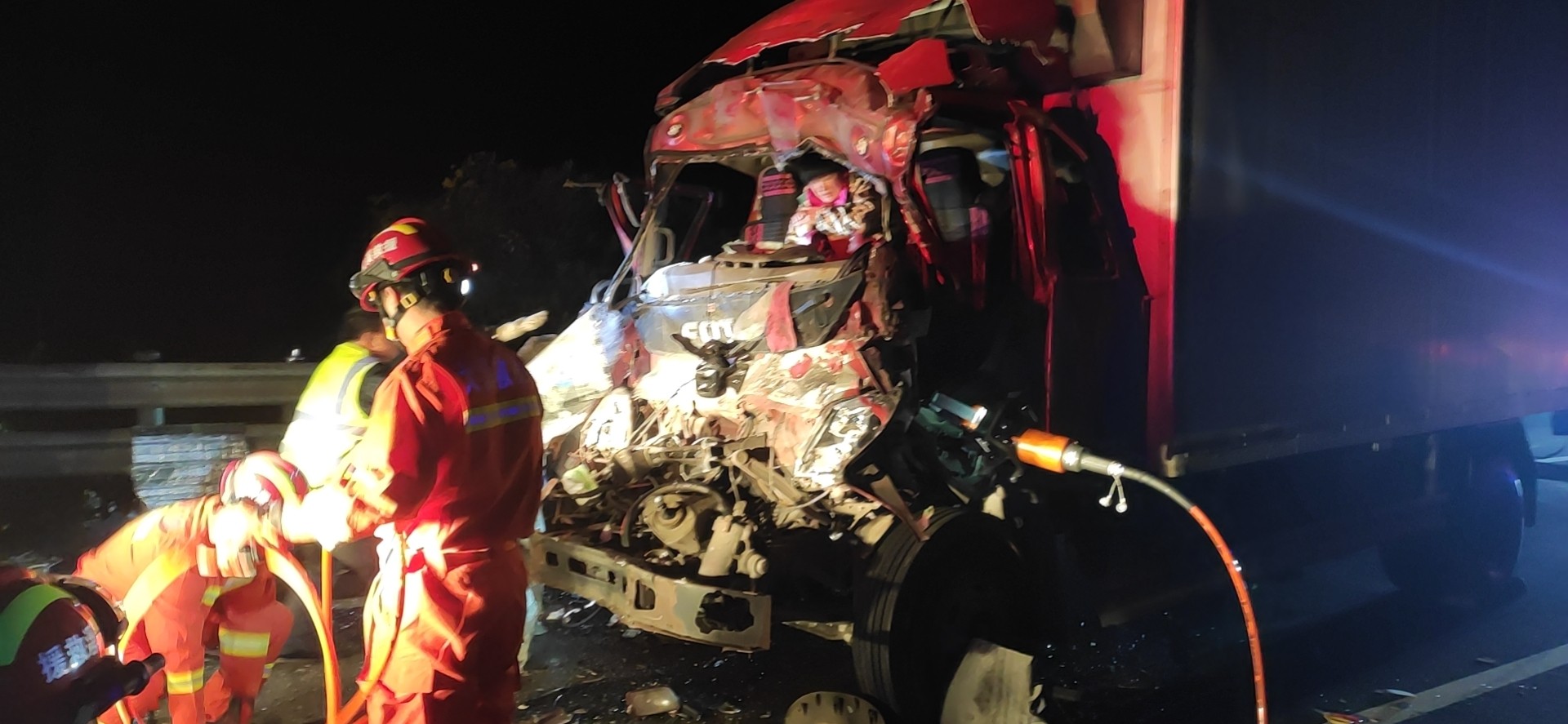 此次事故是貨車拋錨引起二次追尾,第一輛貨車拋錨停在慢車道上,在車后方設(shè)置了小紅帽,由于天黑車速快,第二輛貨車采取了緊急制動,第三輛避讓不及與前貨車追尾,造成車頭嚴(yán)重受損,司機和司乘人員受傷,而第二輛貨車卻逃逸了。高速公路上晚上行車視線不好,貨車又特別多,車輛拋錨要“車靠邊、人撤離、即報警”,肇事車未靠邊,引發(fā)后車相繼追尾,希望司機朋友們開車時注意保持車距,謹(jǐn)遵9字警句,防止疲勞駕駛。 陳旦平