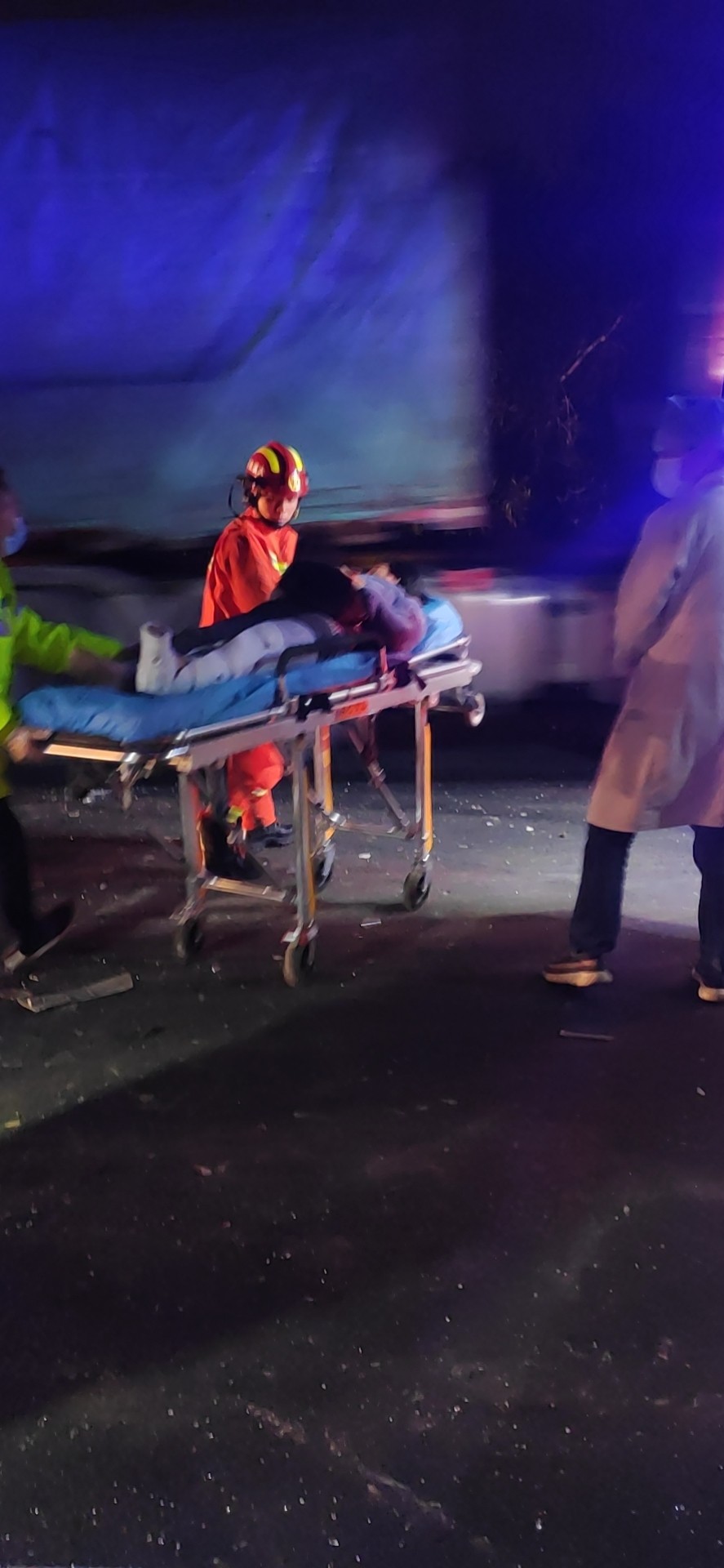 21:50巡邏車和消防車同時到達現(xiàn)場,隊員陳幸飛快的跑下來,以百米沖刺的速度做好巡邏車的安全措施和預(yù)警工作,有3人受傷,事故車頭已嚴(yán)重變形,一名女性腰部受傷坐在地上,語速正常,思維清晰。還有二名人員被卡在駕駛室,消防隊員正在查看現(xiàn)場準(zhǔn)備施救,受傷人員哭爹喊娘嚎聲不斷,由于救護車還沒達到現(xiàn)場,陳幸在事故車后方硬路肩上維護秩序,防止車輛占道,并同時迎接救護車,湯寧光則在維護現(xiàn)場秩序,阻止其他司機圍觀影響救援。 22:00第一輛救護車到達。醫(yī)護人員準(zhǔn)備擔(dān)架,另一名醫(yī)生去詢問坐在地上的受傷人員,由于車頭嚴(yán)重變形,司機與鄰座的人都被卡在駕駛室,經(jīng)過消防員的救援,受傷最嚴(yán)重的司機首先被救了下來,在被救下的那刻暈了過去,醫(yī)護人員立該把傷員抬上救護車,緊接著消防員救下第二位被卡傷員,第二輛救護車帶著傷員離開,最后一輛救護車卻遲遲沒到,經(jīng)聯(lián)系監(jiān)控中心后得知救護車已上高速,但因后方車輛太多,救護車和拖車都被堵了,經(jīng)和臺州高速交警協(xié)商后,最后清理一個車道讓救護車和拖車先開上來,巡邏車去事故車后方預(yù)警,22:30救護車帶走最后一名傷員,事故車被拖走,路面恢復(fù)正常通車。