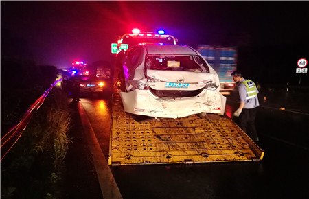 30分鐘后,第二批施救車與消防、醫院救護車幾乎同時到達現場,現場立即展開一場齊心協力的生命救援。交警指揮交通讓出綠色通道,醫務采取緊急救護保證生命體征,施救中心兵分兩組,一組與消防和通力合作營救卡在車中傷者,另一組按先易后難順序拖離兩輛受損轎車。為了生命為了安全暢通,現場每一個人都在爭分奪秒。(圖4)