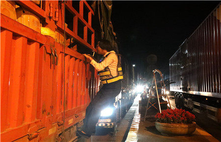 夜間綠農車輛多,據統計,當天凌晨早班臨海南收費所出口綠農車108輛,是平時日均數量的八九倍。短時間內的“井噴式”增長,這又是一個大考驗?!叭柧G色”、“一號綠色”、“二號綠色”……“來啦!”旁站人員箭步沖過去拍照取證、檢查車輛。大貨車又高又寬,平時需登專用扶梯進行檢查,可在大流量面前保安全省時間是第一要旨,這些個巾幗女將們面對高貨車,一手拉著車把,一腳踩在車杠上,迅速上車開展核查,執行速度絲毫不遜于男同志。有時剛從這輛貨車上下來,又立刻奔向了其它車道。晴夜當空,車道間一個個忙碌的身影不停穿梭著,卻不言乏力。