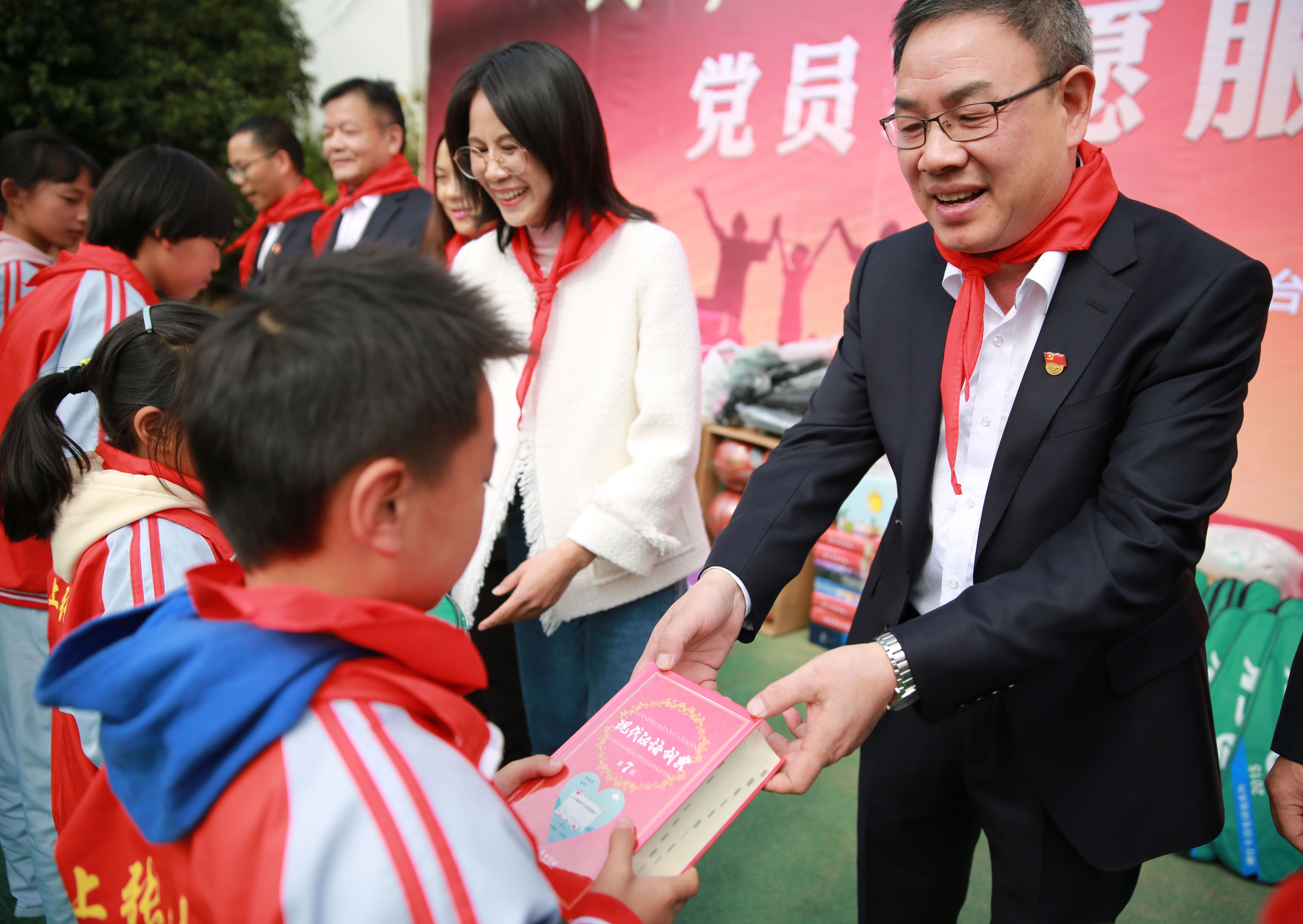 在“點亮微心愿”環節,臺州高速集團領導班子們為學生代表送上新衣服、學習用品等,孩子們則為志愿者叔叔阿姨們系上了在他們眼中最珍貴的紅領巾。