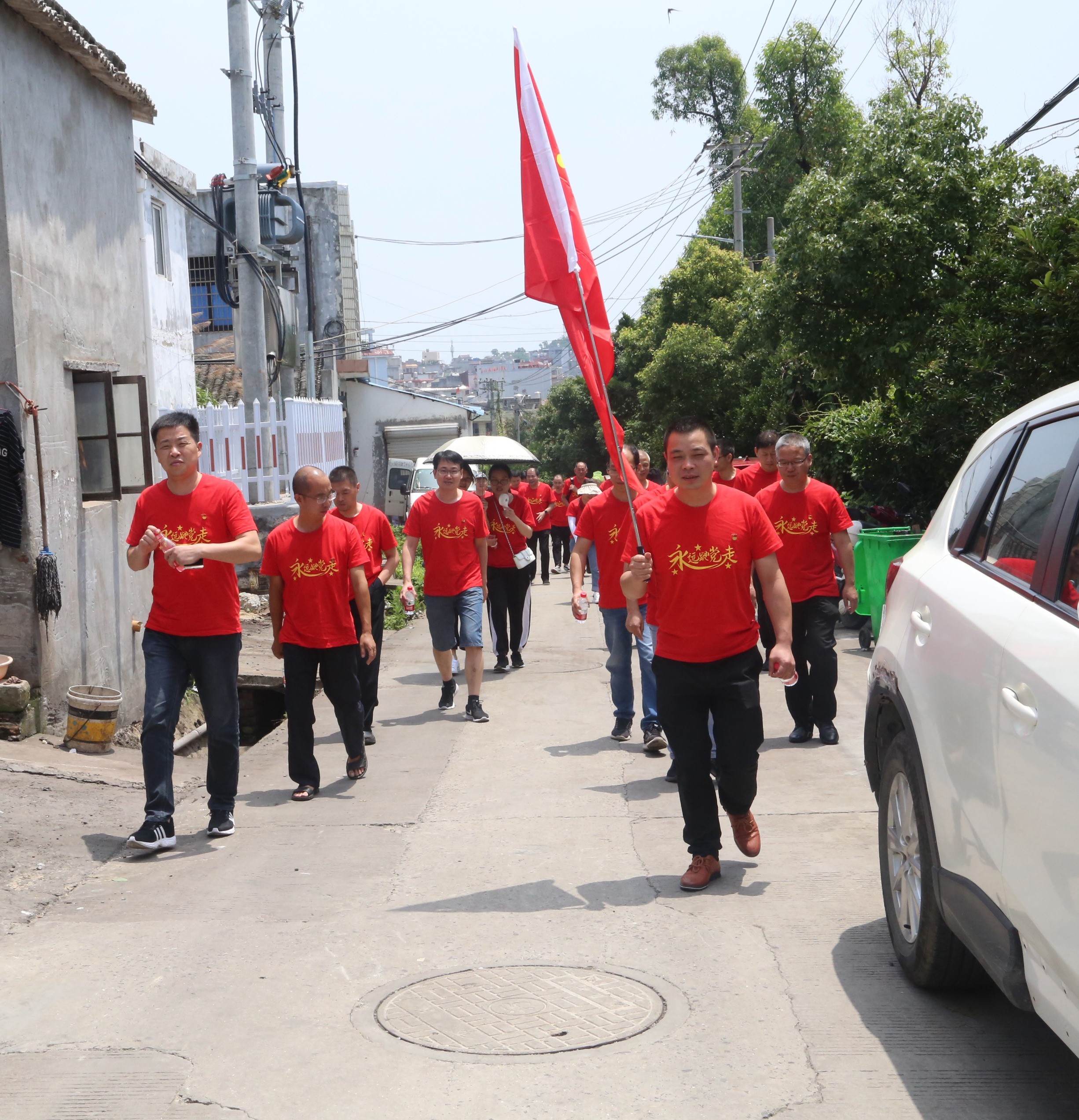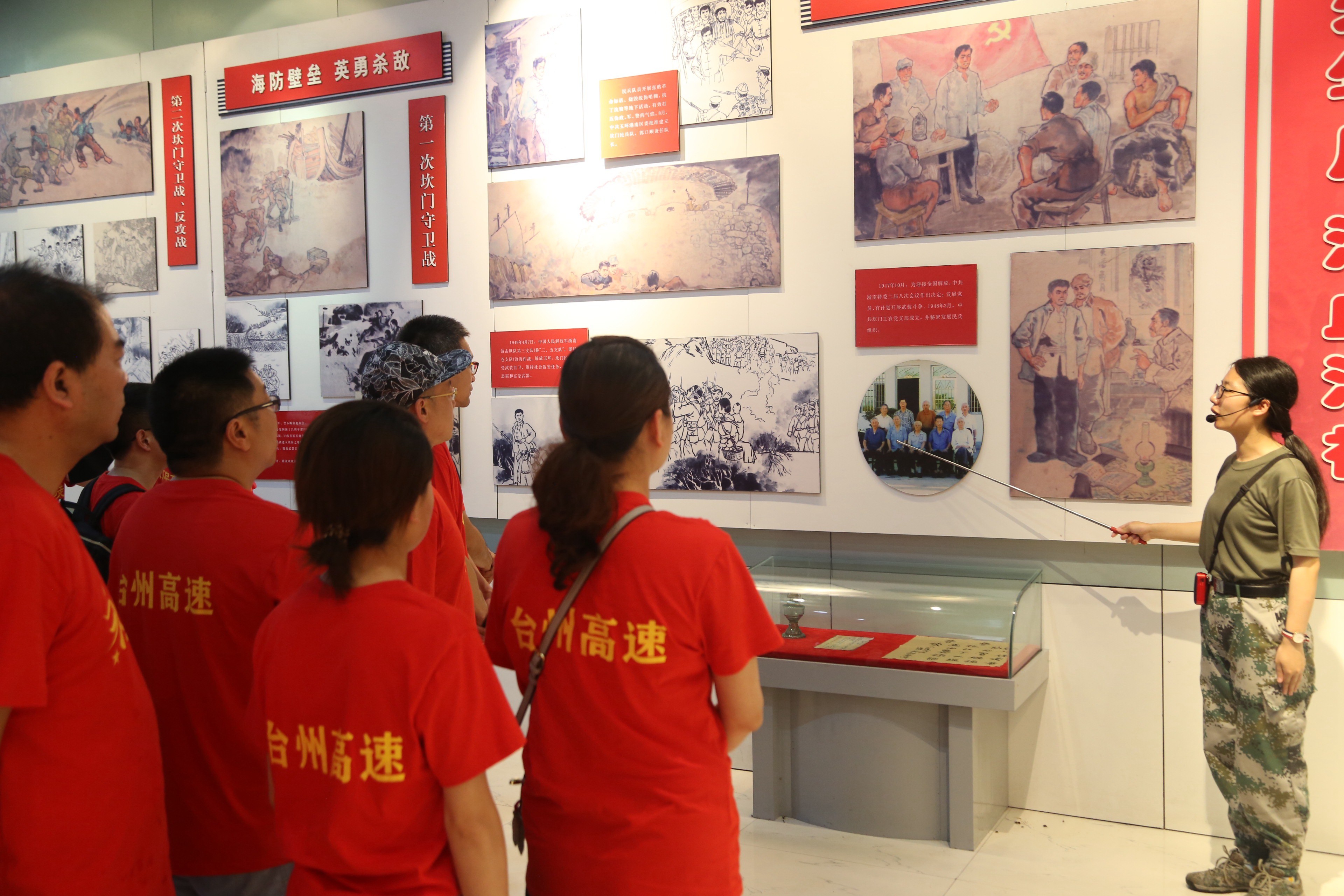 活動當天,烈日炎炎抵擋不住大家追溯紅色基地的熱情,黨員隊伍緊跟黨旗,順著“紅色地圖”,沿著崎嶇小道,大步爬上玉環坎門英雄基干民兵營。在女民兵們的熱心引導和生動解說下,大家側耳傾聽,目不轉睛地觀看展示墻上與玻璃柜中的民兵隊歷史事跡照片、繳獲的槍支、文件與榮譽獎章等等,玉環坎門人民的紅色抗爭歷史仿佛仍歷歷在目,打動著每位黨員的內心。隨后,大家在黨旗前光榮宣誓,重溫入黨誓詞,各位黨員緊握右拳,用洪亮的聲音表達著自己對黨的忠誠,對初心使命的矢志不渝。