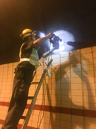 圖為工作人員安裝消防燈燈泡 大溪嶺—湖霧嶺隧道全長4116米,為保障隧道內(nèi)行車安全、暢通、舒適,定期組織安排清洗隧道兩壁墻體、邊溝,檢修內(nèi)部各項機電設施成了維養(yǎng)中心每季必不可少的工作之一。而每次清洗檢修必將涉及封道,為最大程度減少因封道對社會造成的負面影響,中心工作人員早在一周前就對隧道內(nèi)各項損壞機電設備進行摸底統(tǒng)計,以便合理制定維修方案和安排施工人員。 12號早上7點,隨著封道工作就緒,兩組清洗隊伍分別從隧道中部開始向兩頭清洗,六組專業(yè)燈具維修人員站在貨車腳手架上由北往南逐個推進,發(fā)現(xiàn)一盞修復一盞,或更換燈管、或更換觸發(fā)器、或更換鎮(zhèn)流器,對于一些同時有多個配件壞死或腐蝕嚴重的燈具就直接采取整體更換措施,大大提高了工作效率。而中心工作人員除了現(xiàn)場全程協(xié)調(diào)管理以外,還負責修復隧道兩壁逃生標志及報警電話等多個指示牌。按照之前制定的計劃,六人兵分兩組由隧道兩頭分別向中間修復,這樣既能與其他工作同時進行又不造成相互干擾。另外一人則配合隧道所一起在登高車協(xié)助下,對洞內(nèi)各類攝像頭進行逐個清理,全場人員各司其職,各盡其責,現(xiàn)場一派忙碌的景象。 4公里多長的隧道,由于流動性差,洞內(nèi)空氣質(zhì)量比霧霾嚴重數(shù)倍,僅一只口罩根本凈化不了廢氣,但由于時間緊,任務重,中心隊員和施工人員顧不上惡劣的環(huán)境,努力和時間賽跑,兩日下來共修復(清理)損壞燈具100余套,各類標志指示牌40余塊,攝像頭30余個,恢復了隧道內(nèi)各項機電設施的正常運行,排除一切安全隱患,有效保證了隧道安全暢通。 項寅曉