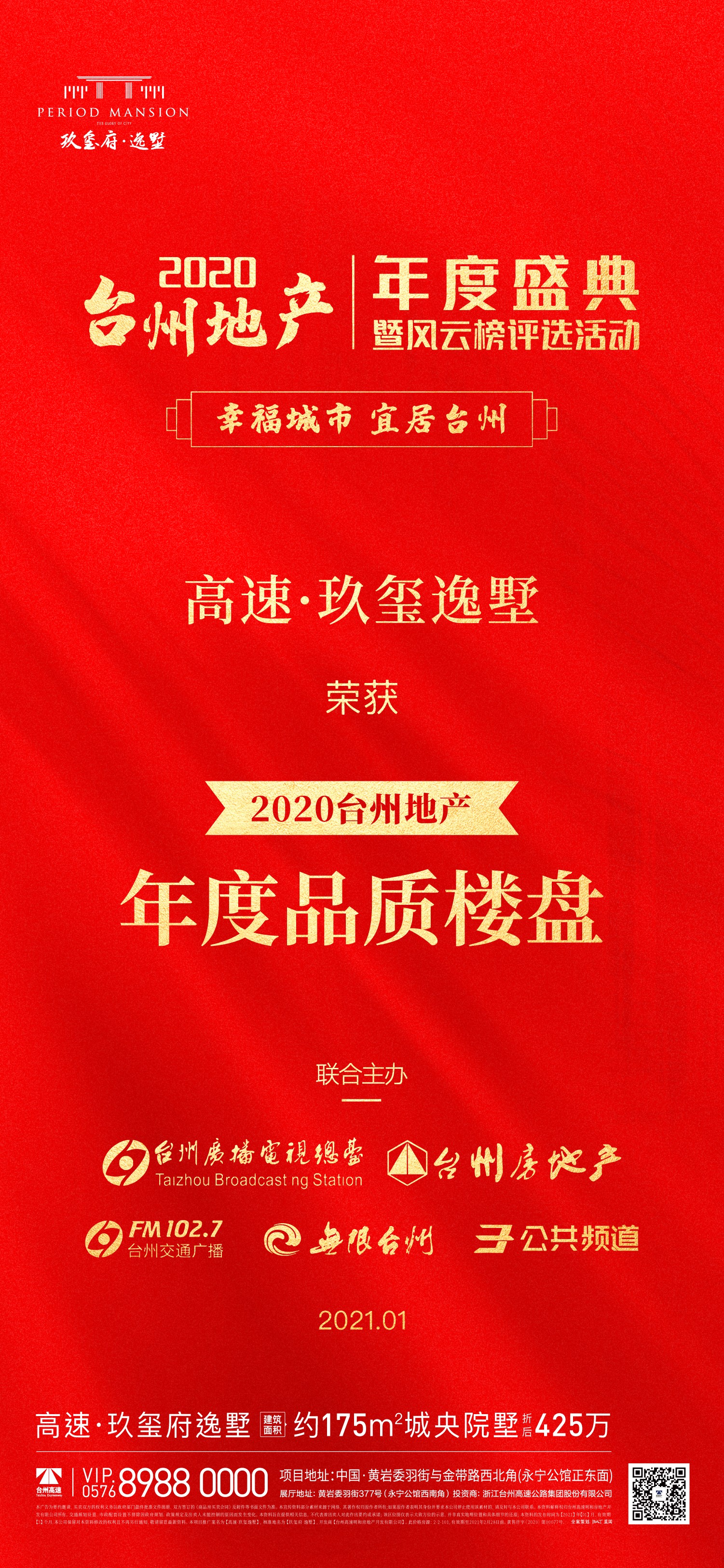 2021年1月19日下午,由臺州廣播電影電視集團聯(lián)合臺州市房地產(chǎn)業(yè)協(xié)會共同舉辦的2020臺州地產(chǎn)年度盛典暨臺州地產(chǎn)風(fēng)云榜,在全城熱矚下重磅舉行。高速房產(chǎn)玖璽府·逸墅項目榮獲“2020臺州地產(chǎn)年度品質(zhì)樓盤”榮譽稱號。