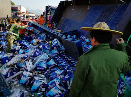 8月25日凌晨4點(diǎn),甬臺(tái)溫高速溫向1648+7路段,一輛運(yùn)啤酒的大貨車(chē)因司機(jī)疲勞駕駛,導(dǎo)致車(chē)輛撞上中央護(hù)欄而側(cè)翻,啤酒灑滿(mǎn)一地,后方兩輛貨車(chē)避讓不及造成多車(chē)事故。