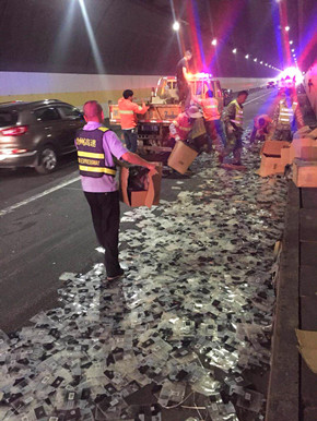 兩起事故的接連發(fā)生使救援工作緊張。2分鐘后,執(zhí)勤隊(duì)火速趕到了事故現(xiàn)場(chǎng),為了以最短時(shí)間恢復(fù)正常通行,隊(duì)長(zhǎng)謝永濱決定兵分兩組,一組自己帶隊(duì)對(duì)第二起事故立即進(jìn)行處理,讓輕微擦傷的三輛事故車(chē)先撤離現(xiàn)場(chǎng),在下個(gè)出口等待交警處置,并向監(jiān)控中心通知需拖車(chē)前來(lái)施救,與此同時(shí)加強(qiáng)預(yù)警,快速疏導(dǎo)交通。另一組由執(zhí)勤隊(duì)員跑步前進(jìn)查看事故現(xiàn)場(chǎng),了解車(chē)輛情況。經(jīng)查看,該貨車(chē)因爆胎導(dǎo)致撞車(chē),所幸側(cè)翻事故未造成人員傷亡。在各部門(mén)的通力配合下,一個(gè)小時(shí)后,事故現(xiàn)場(chǎng)清理完畢,隧道恢復(fù)了正常通行。