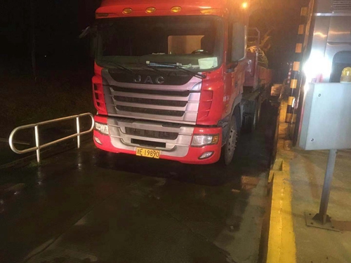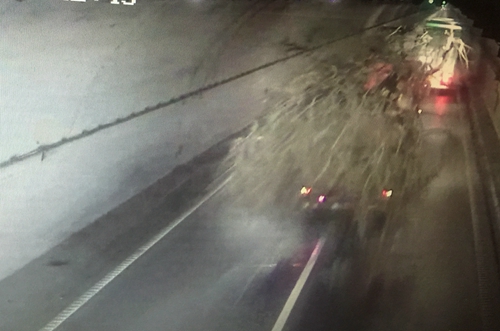 圖為超高超寬的運樹大貨車 5:10分,違章大貨車通過黃土嶺隧道,由于大貨司機一直違章占隧道中線行駛,未對黃土嶺隧道設施設備造成影響,執勤隊員便跟在違章車輛后面關注其進出口動向。 5:29分,違章車輛在臺州南副站出口處被執勤隊截停,等待處理善后事故的交警車輛到來。