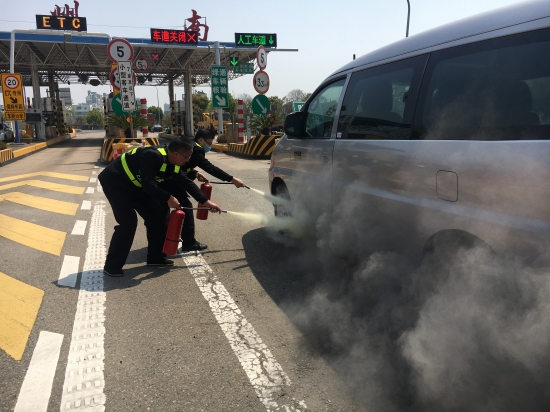 圖為交通事故應急演練 在收費廣場交通事故應急預案演練中,該所模擬了汽車在收費車道起火的交通事故。事故發(fā)生后,當班班長第一時間啟動預案,將險情報告監(jiān)控員,并立即關閉事故車道,組織人員對起火點進行前期壓制,同時指揮人員擺放標志,引導后續(xù)車輛,并快速放行。接到險情報告的所長、辦公室人員迅速趕到現(xiàn)場參與救援:女同志協(xié)助班組開足車道;部分男同志負責出入口車輛的疏導指揮工作;其余人員負責對火災進行撲滅……大家各司其職,快速處理險情。