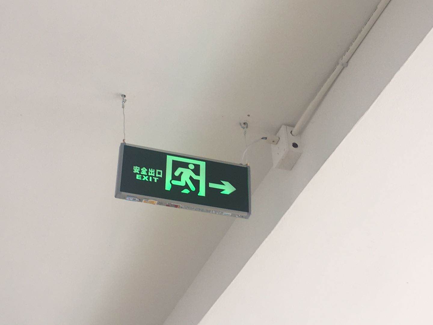 圖為技術人員安裝現場 在得知這一情況后,維養中心積極協助收費站所購買相關的主材及配件,并主動承擔了這些設備安裝工作。由于設備安裝位置很多沒有直接可用電源,中心技術員們就從四五米外甚至更遠的地方,一路套管放線過來取電,并用電錘等工具為其開孔固定,最后再完成接線送電。經過2天努力,這些帶有方向提示標識、安全出口標識的燈牌被安裝在各層樓梯出口、拐角或主要通道上,因全部帶有儲電功能,即便在斷電的情況下也能發光發亮。
