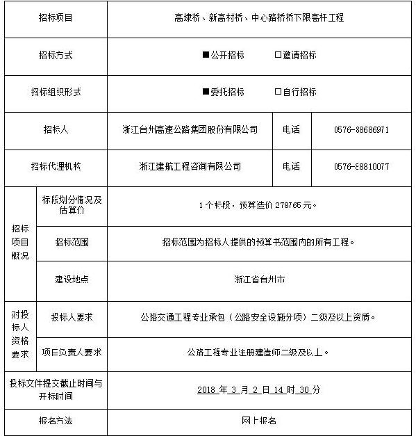 高埭橋、新高村橋、中心路橋橋下限高桿工程招標(biāo)公告