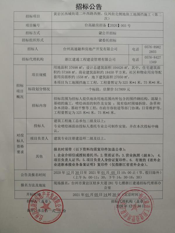 黃巖區(qū)西城街道二環(huán)西路西側(cè)、儀風(fēng)街北側(cè)地塊工地圍擋施工(第二次)招標(biāo)公告