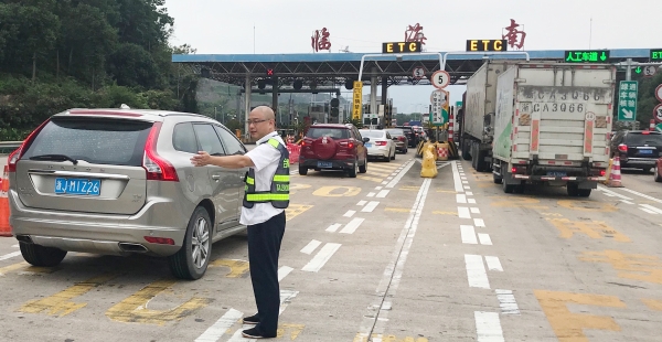 節日期間,車流量比往日多很多,每天多次出現長時間大分流,一遇上高峰期車輛源源不斷地從各個方向匯聚在此,容易造成內外廣場堵車。臨海南收費所車輛雖多,但該站所出口秩序井然,未出現擁堵現象。瞧!這位在車流中,身著反光背心在這場大車流中,揮舞著雙臂指揮著交通,讓飛馳的車輛通過客貨分離,有效降低客貨車隨意串道,達到快速放行的是四班班長楊俊輝。