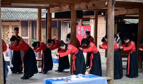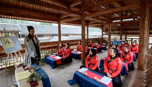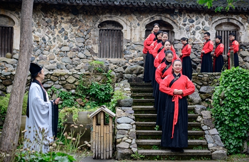 課堂正式開始前進行了一場隆重的“開學儀式”。 據《禮記》記載:“禮義之始,在于正容體,齊顏色,順辭令。”因此,第一課即是“正衣冠”。同學們換上漢服,一一站立,由先生依次檢查,然后“衣冠整齊”地排著隊集合。之后按照先生的要求,將手放到水盆中“凈手”,寓意凈手靜心,去雜存精,希望能在日后的學習中專心致志、心無旁騖。步入學堂后,舉行拜師禮,同學們向至圣先師孔子三叩首、進獻“釋菜禮”,寓意尊師重道、勤奮好學。