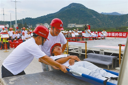 7月5日,在市內環路(黃巖段)7+120-10+170工程施工現場,救援人員將“高處墜落”工人抬向救護車輛。當日,內環路(黃巖段)舉行了應急救援演練活動,演練以分組競賽的形式舉行。施工單位、監理單位及臺州高速市政建設投資有限公司員工等近200人參加了演練。 http://paper.taizhou.com.cn/tzrb/html/2017-07/07/content_818958.htmfrom=singlemessage&isappinstalled=0